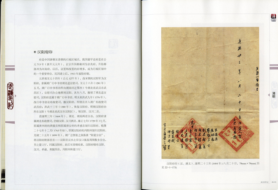 《武汉印记》一书,以武汉市档案馆藏反映武汉地区城市发展历史、地方行政建制变迁、能凸显武汉中心城市地位的钤记和印模为主体,辅以印章使用机构的文字说明。不仅从一个独特的角度印证了政治制度的变革、民国时期的官制、用印制度和文书制度,也印记下大武汉民国华中政治、经济、交通、文教中心的荣辱兴衰及曲折的建市与市政发展史,从中可以管窥中国近现代城市的变迁。此书既能成为鉴别历史文件(可移动文物)的参考书,也是一部“印说武汉行政建制史”,填补了武汉城市史研究的空白。