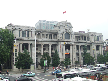 主体建筑高约20 米,面对长江, 横立面开阔伸展,自左至右分五段构图。中部大门及两侧外门均由十五级踏步进入二层营业厅。正面为宽敞通透柱廊,内廊镶嵌大理石墙裙,以十根巨大的爱奥尼立柱及六根方柱为支撑,全部为麻石拼接,柱头为向下的涡卷纹雕饰,柱高至三层顶。外墙贴面及基座为花岗岩构件,基座、门窗、腰线、檐口、压顶等部位都有石刻花饰。