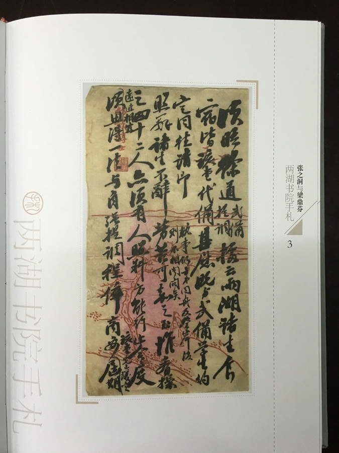 武汉市档案馆和武汉博物馆联合编辑的《张之洞与梁鼎芬两湖书院手札》完成后,2016年12月正式出版。选用张之洞手札原件27件,梁鼎芬手札原件13件。手札中不乏王秉恩、王同愈、蒯光典、黄体芳、汪康年等大家名号出现,言及出国留学生选拔、学生看操、学校放假、师生礼仪、制服银两、学科题目等事宜。可以窥见两湖书院的革新历程,或可对武汉今时的改革创新和发展有所启迪借鉴。