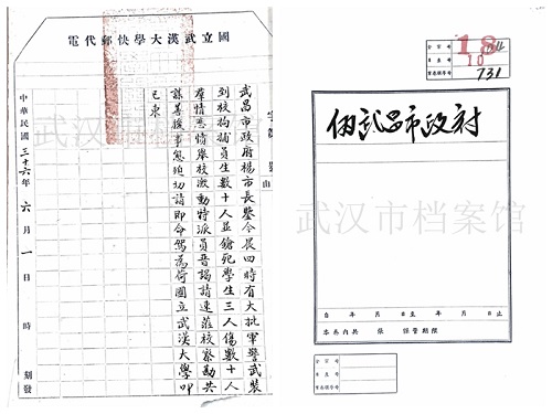 六一惨案后武汉大学发给武昌市政府市长杨锦昱的电报