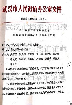馆藏《关于聘请西德专家格里希担任武汉柴油机厂厂长的会议纪要》