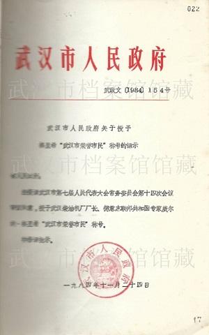 馆藏《武汉市人民政府关于授予格里希“武汉市荣誉市民”称号的请示》