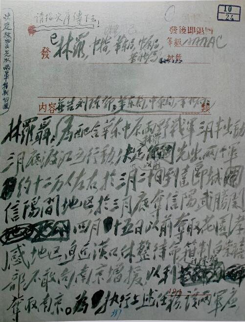 1949年2月12日,毛泽东起草中央军委关于第四野战军先出两个军迫近汉口钳制白崇禧部电报手稿(节选)
