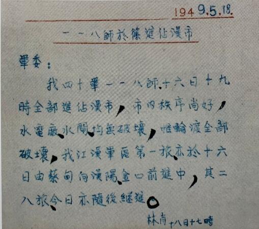 1949年5月18日,林彪、萧克关于第一一八师全部进占汉口市致中央军委的电报