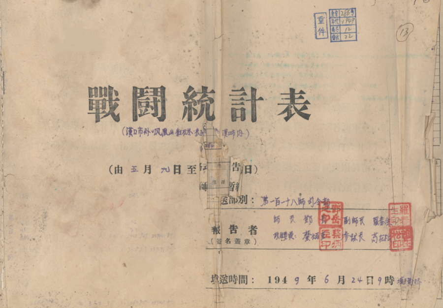 这份档案是第一一八师1949年5月9日至6月某日的战斗统计表电子版,原件藏于解放军档案馆。该表是第一一八师司令部报送,于1949年6月24日9时在咸宁贺胜桥填写,有师长邓岳、政治委员蔡炳臣、副师长罗春生、参谋长苟在松的签名及印章。该表详细记载了第一一八师1949年5月9日至6月2日在解放汉口前后的战斗情况,统计的战斗范围包括汉口市外围的表子湾、红石岭、凤凰山和汉口市内。