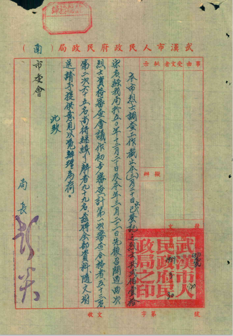 1951年武汉市人民政府民政局关于烈士资格审查情况给中共武汉市委的函(武汉市档案馆馆藏)