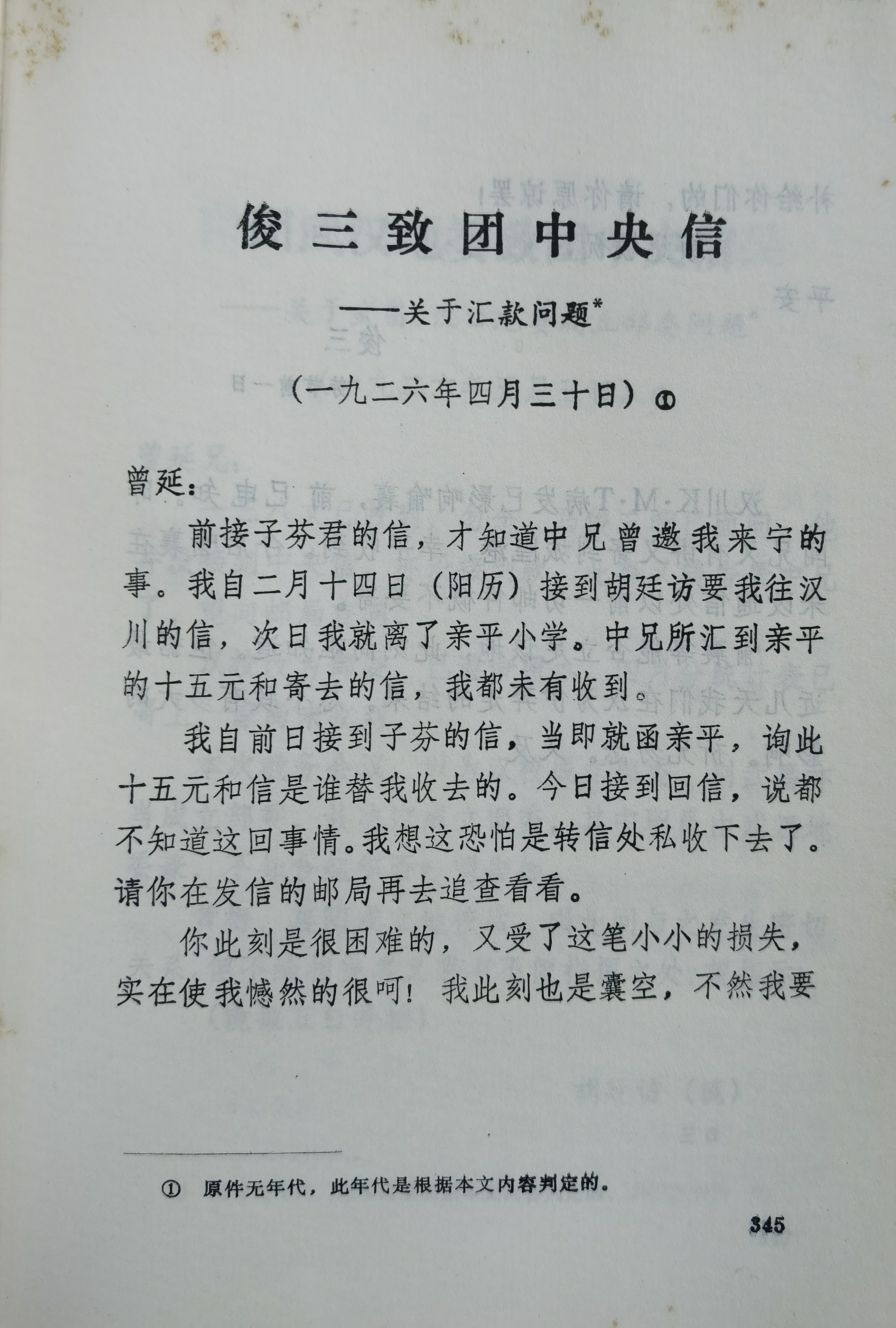 1926年4月30日马俊三关于汇款问题致团中央的信