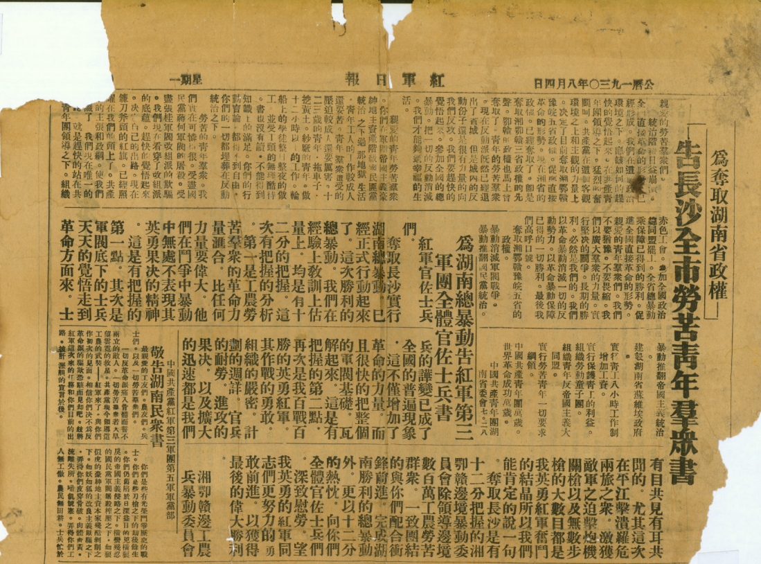 93年前的长沙城中,八月酷暑,战火硝烟尚未散尽,有一份报纸连夜组织编发。虽只出版了短短6期,却被当时知名的《大公报》如此称赞:“红军戎马倥偬,犹知注重报纸宣传,不稍疏懈,吾人对之,宁无愧色乎?”这份报纸便是中国工农红军第三军团编发的《红军日报》。