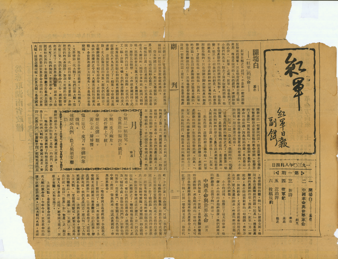 此外,副刊亦是《红军日报》的一大特色。从第2期开设“血光”文艺专栏,到第6期又将第5版扩充为“红军”副镌,《红军日报》副刊的分量可谓是愈来愈重。与当时其他报纸“吟风弄月”式的副刊迥异,《红军日报》的副刊是战斗的文艺。左基忠在“红军”副镌发刊词《开场白——“红军”的使命》中指出:“红军日报之有副刊,不是和一般所谓报屁股那样简单,……他不是资产阶级撩抱的调情的玩物。他是什么,他只是一朵血滴滴的鲜花,火一般赤热的鲜花”。“血光”栏目采用民歌、民谣、童谣、新三字经等形式,如《革命伤心记(四川调)》《告敌方士兵歌(月月红)》《莺花怨·哭五更》《反国民党军阀混战(莲花闹)》《工农兵(孟姜女哭长城调)》等,或控诉,或鞭挞,或讴歌,通俗易懂,能引起当时群众的广泛共鸣;“红军”副镌则刊有评论、散文、新诗各一篇,均是“血滴滴的鲜花”。左基忠(1902-1932)是湖南浏阳人,1927年加入中国共产党,“常以思想进步,文论精辟见称”。编发《红军日报》时,他年仅28岁,是党内不可多得的宣传人才。《红军日报》6篇社论有4篇出自他的手笔,8月4日的“红军”副镌还发表了他的散文《从军杂记(一) 长笛一声人去也》。1930年8月,左基忠任红三军团政治部宣传部部长,1932年在中央苏区肃反扩大化运动中被诬为“AB团”错杀,新中国成立后被追认为革命烈士。