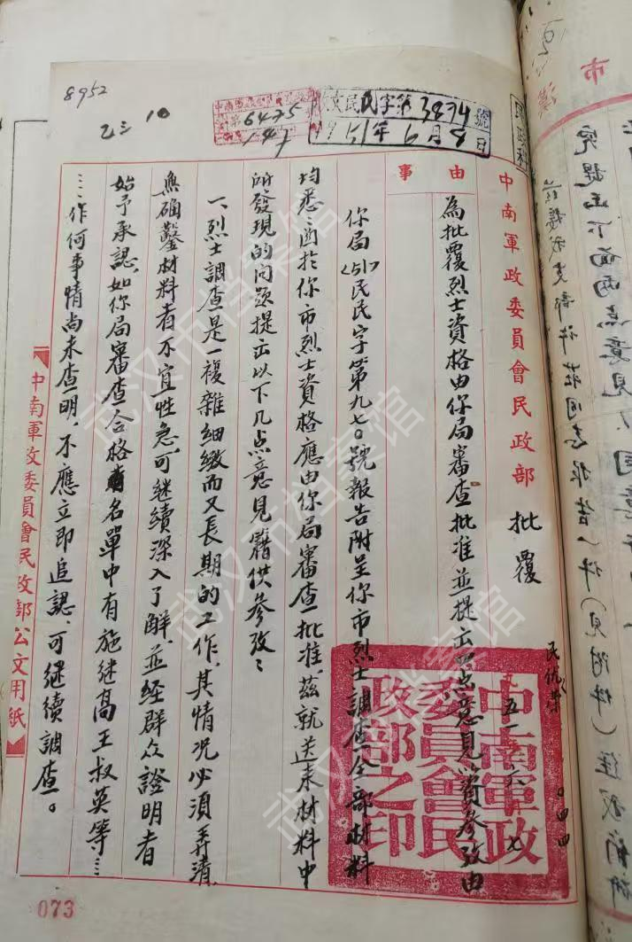 1951年6月8日,中南军政委员会民政部给武汉市人民政府民政局的《为批复烈士资格由你局审查批准并提出四点意见以资参改由》。