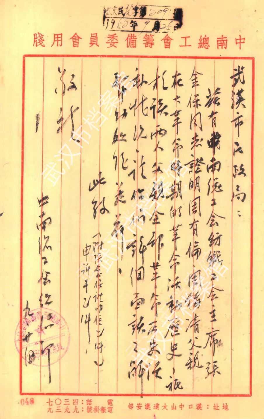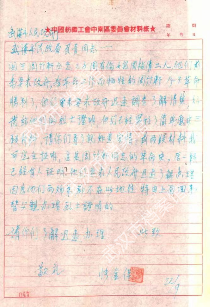 9月24日,中南总工会纺织工会给武汉市民政局发送函件,证明烈士周竹轩的情况。