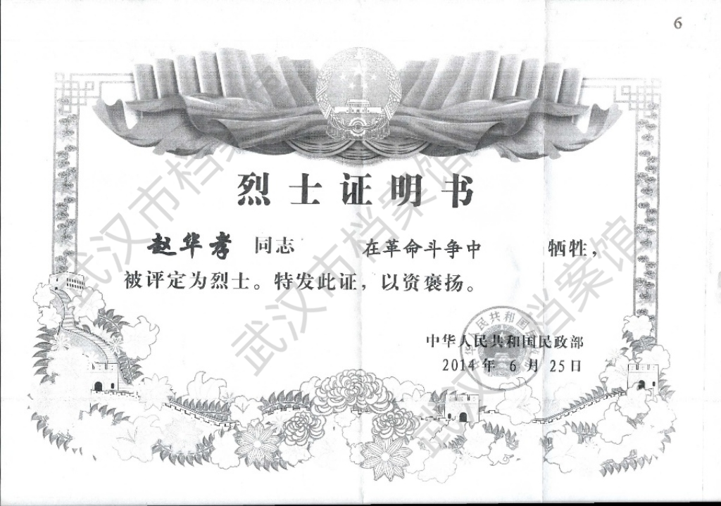 翻开武汉市档案馆馆藏档案,1957年武汉市民政局就关于了解青山区在抗日战争中牺牲的烈士情况进行了深入调查。通过武汉市青山区人民委员会的调查表可知,赵华应位列第12、赵华孝位列第13 ,其中赵华应为赵华孝的堂弟。