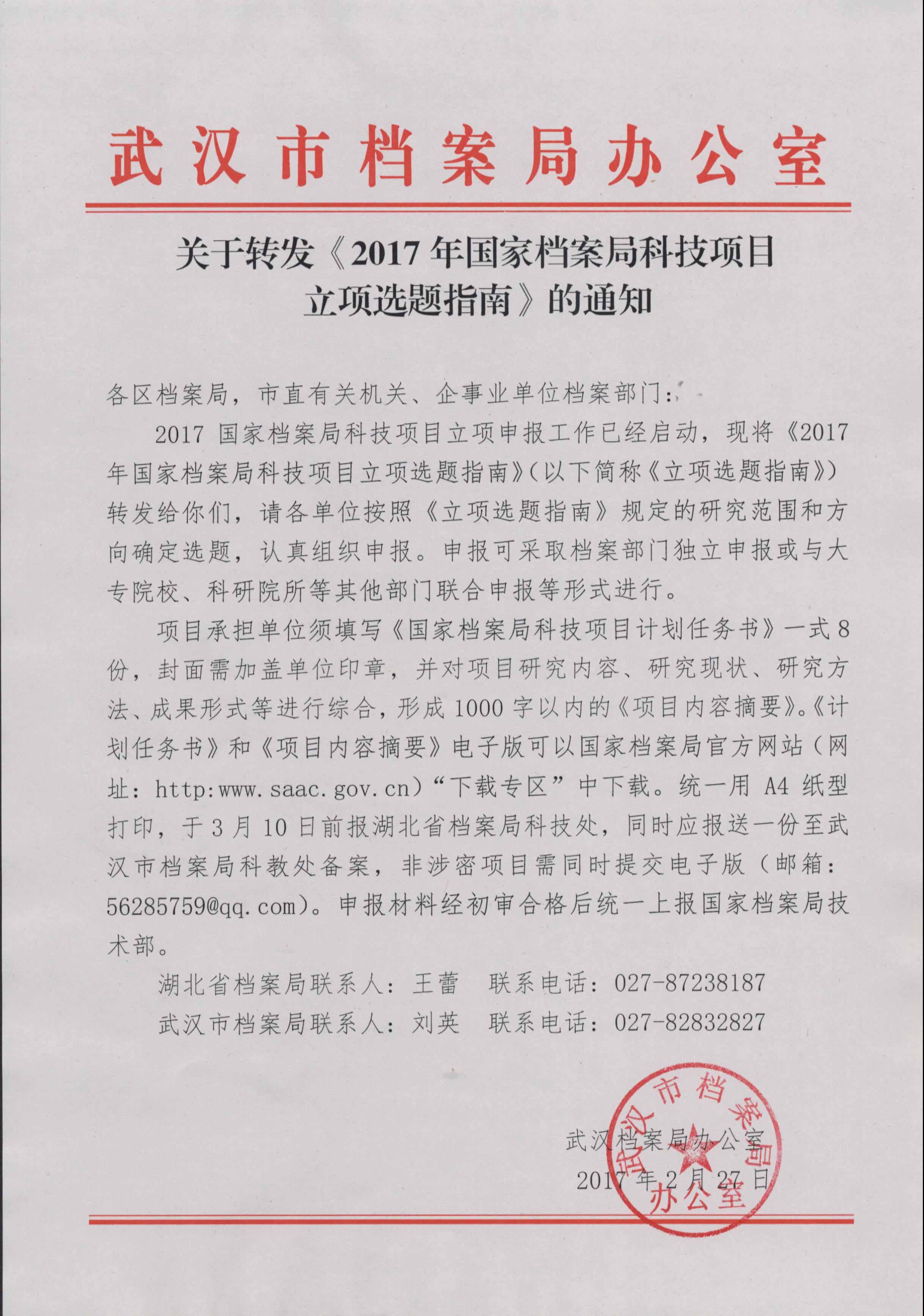 项目承担单位须填写《国家档案局科技项目计划任务书》一式8份,封面需加盖单位印章,并对项目研究内容、研究现状、研究方法、成果形式等进行综合,形成1000字以内的《项目内容摘要》。《计划任务书》和《项目内容摘要》电子版可以国家档案局官方网站(网址:http:www.saac.gov.cn)“下载专区”中下载。统一用A4纸型打印,于3月10日前报湖北省档案局科技处,同时应报送一份至武汉市档案局科教处备案,非涉密项目需同时提交电子版(邮箱:56285759@qq.com)。申报材料经初审合格后统一上报国家档案局技术部。