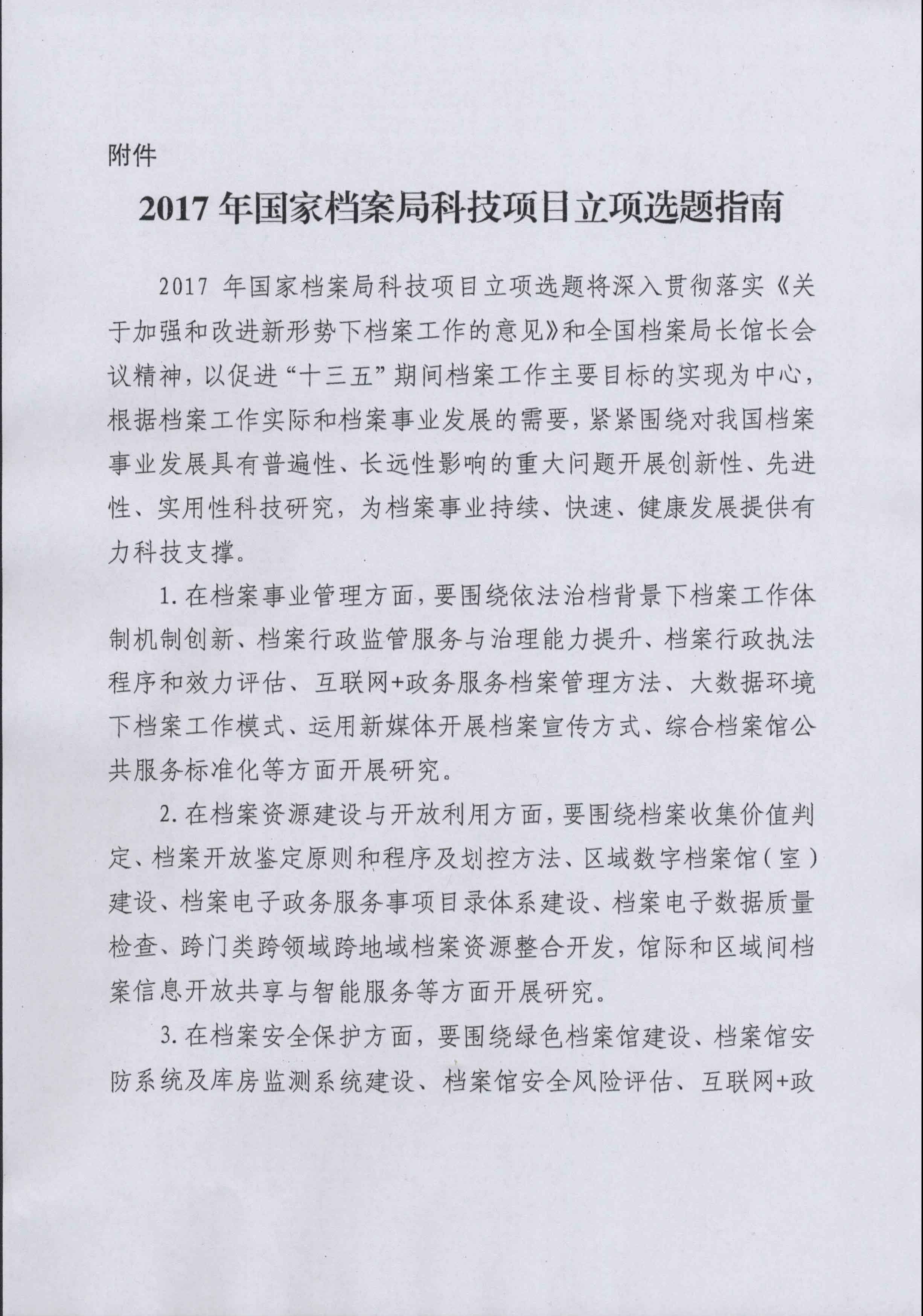 2017国家档案局科技项目立项申报工作已经启动,现将《2017年国家档案局科技项目立项选题指南》(以下简称《立项选题指南》)转发给你们,请各单位按照《立项选题指南》规定的研究范围和方向确定选题,认真组织申报。申报可采取档案部门独立申报或与大专院校、科研院所等其他部门联合申报等形式进行。