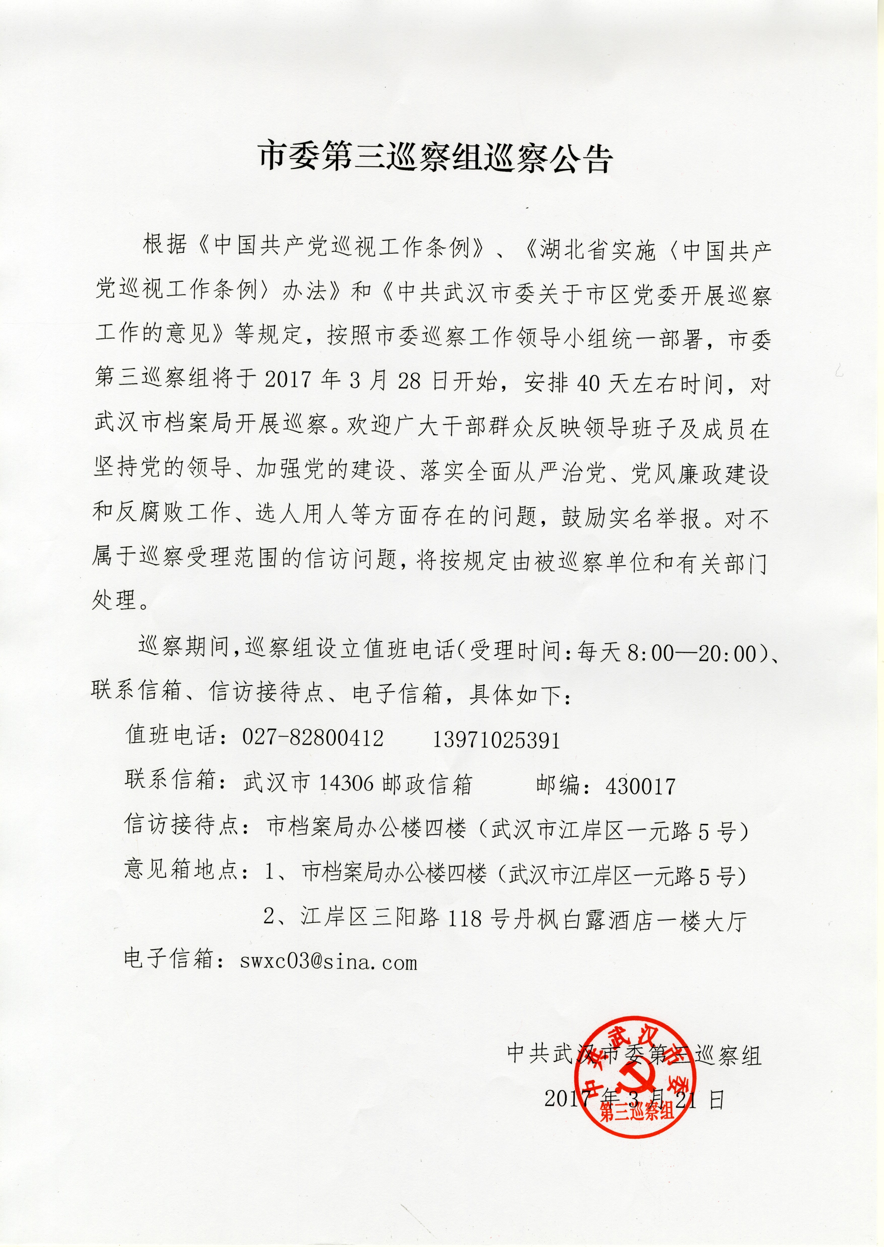 市委第三巡察组巡察公告