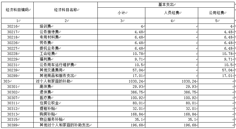 ⑵ 对个人和家庭补助支出1030.24万元,主要用于离休费、退休费、医疗费、住房公积金、提租补贴、购房补贴、物业服务补贴、其他对个人和家庭的补助支出。