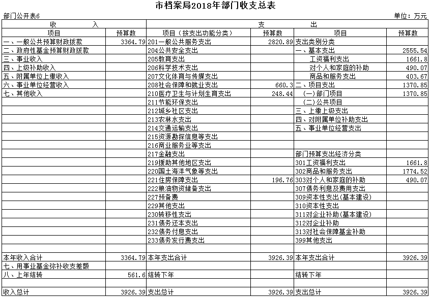 表6.市档案局2018年部门收支总表