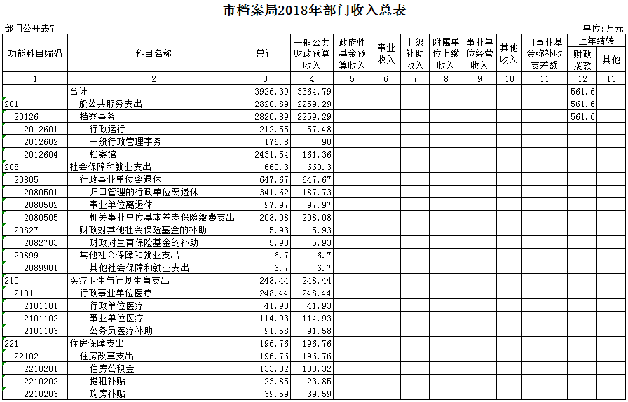 表7.市档案局2018年部门收入总表
