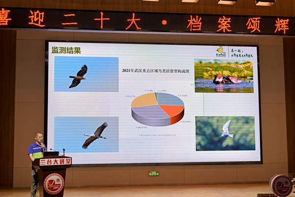 6月8日,值第十五个国际档案日来临之际,武汉市档案馆以“喜迎二十大·档案颂辉煌”为主题,举办了2022年“兰台大讲堂”第1期档案公开课暨“武汉湿地与鸟类照片档案展”开幕式活动,深入学习贯彻习近平生态文明思想,宣传普及《中华人民共和国湿地保护法》,积极营造迎接党的二十大胜利召开的浓厚氛围。