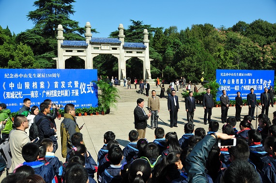 为纪念孙中山先生诞辰150周年纪念日,11月2日,由南京市档案局(馆)、南京市规划局、中山陵园管理局、南京出版传媒集团·南京出版社共同编纂出版的《中山陵档案》丛书首发式,南京市档案局、中山陵园管理局、广州市档案局共同举办的“双城记忆——南京·广州档案史料展”开展仪式在中山陵博爱广场隆重举行。南京市副市长胡万进,江苏省档案局副局长赵深、南京市规划局局长叶斌、中山陵园管理局局长黄辉、南京出版传媒集团董事长朱同芳、南京市档案局副巡视员张军、广州市档案局副局长王书桂等领导出席当日活动。中国第二历史档案馆、东部战区陆军档案馆、南京图书馆、金陵图书馆等单位及逸仙小学、中山小学等学校师生和游人共计300余人参加了首发暨开展仪式。开展当日,有近3000余人线上线下参观了展览。