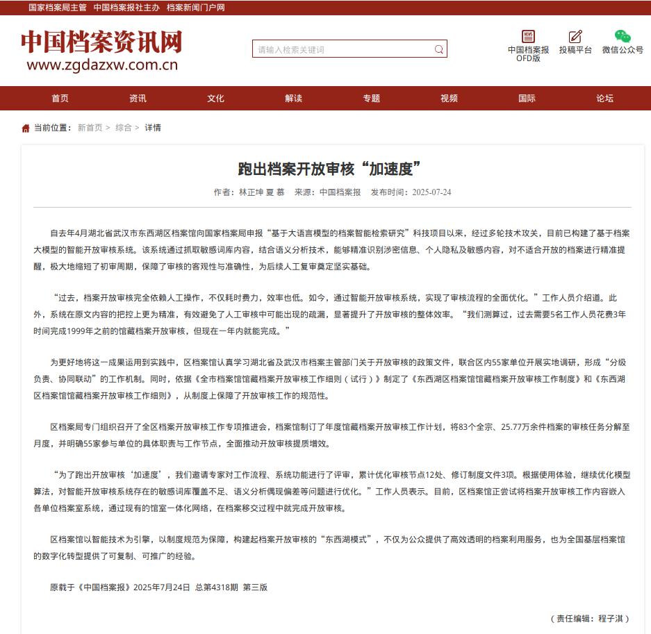 7月24日,《中国档案报》刊登了东西湖区档案馆林正坤、夏慕同志署名的档案工作文章《跑出档案开放审核“加速度”》。该信息介绍了东西湖区档案馆以智能技术为引擎,以制度规范为保障,构建起档案开放审核的“东西湖模式”,为公众提供高效透明的档案利用服务,也为全国基层档案馆的数字化转型提供了可复制、可推广的经验。