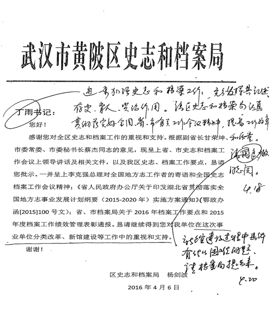 根据黄陂区史志和档案局提出的有关“十三五”史志和档案重点工作内容,4月18日,区委书记丁雨作出批示 :“进一步加强史志和档案工作,充分发挥其记述、存史、育人、资治作用。请区史志和档案局认真贯彻落实好全国、省、市有关工作会议精神,提高工作效率和质量。”区委常委、常务副区长陈国良也作出了“新馆建设过程中具体有什么困难问题,请档案局提出来”的批示。接到丁雨书记和区委领导的批示后,区史志和档案局党组专门召开局党组会,认真学习和讨论。一致认为,丁雨书记及区委领导这么快作出批示,充分体现了对史志和档案工作的重视。区局全体干部应以丁雨书记和区委领导批示为动力,科学谋划、履职尽责,提升史志和档案工作水平;以适应全面建成小康社会,服务于“美丽黄陂”建设为目标,谋求史志和档案事业的新发展;以新馆建设为基础,抓好档案基础设施建设,争取将新馆建成建筑规范、设施先进、功能齐全的新型档案馆;以服务民生为宗旨,构建多元档案资源体系;以依法治档为抓手,加强档案法治宣传、档案业务指导和档案基础业务工作,全面提升黄陂区史志和档案工作水平,为黄陂经济社会的发展作贡献,增添正能量。