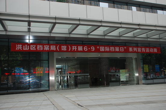 洪山档案新馆门前悬挂今年国际档案日宣传挂图