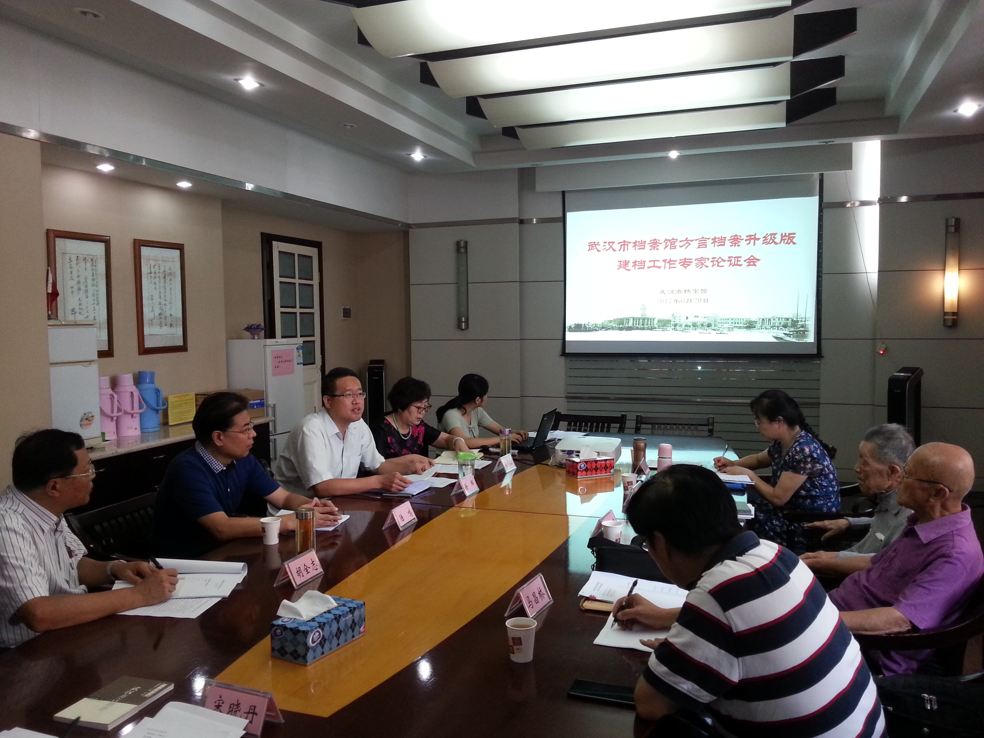 在前期制定方言档案升级版工作方案、武汉特色方言规定文本(名人档案版)和情景小品样本,相关材料提前送达有关方言研究专家10天后,武汉市档案馆方言档案升级版建档工作专家论证会于6月20日上午在武汉市档案馆召开。91岁的华中师范大学教授、语言研究所研究员、武汉方言研究第一人、武汉市文史研究馆馆员朱建颂和90岁的武汉图书馆徐明庭工作室地方文史专家、武汉市文史研究馆馆员徐明庭两位老武汉专家,以站好最后一班岗的责任心参加了此次论证会,并提出了很多建设性的意见。