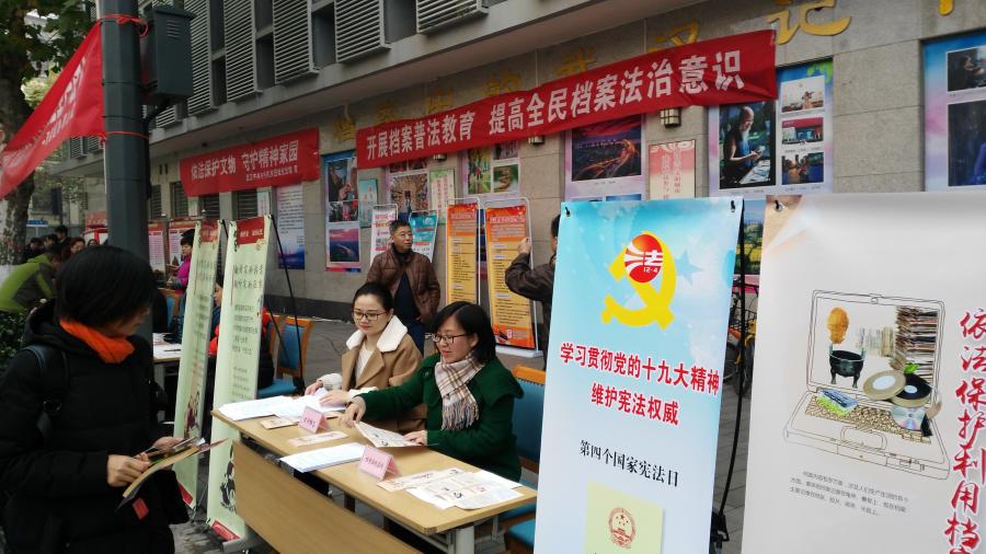 江汉、硚口、汉阳、武昌、东西湖、蔡甸、新洲等区档案局也同步分别在各区政务服务中心、重要公共文化机构等人流量大的场所组织开展现场宣传,制作发放档案法治宣传品5000份以上,受到办事群众和过往路人的欢迎。此外,硚口区档案局还开展了为期一周的档案法治宣传进党校、进机关、进社区、进单位系列活动;东西湖区档案局制作“学习和贯彻党的十九大精神——不忘初心 牢记使命”历史图片展和档案工作成果图片展;蔡甸区史志与档案中心在《蔡甸报》上开辟整版专栏,介绍区档案馆馆藏特色资源;江夏区档案局组织人员观看由区委宣传部、区委法制办、区司法局联合举办的“宪法知识竞赛”活动决赛;新洲区档案局专门定制了5000个环保宣传袋用于6.9和12.4宣传。丰富多彩的活动进一步提高了广大人民群众对档案工作的认识,增强了社会档案法治意识。