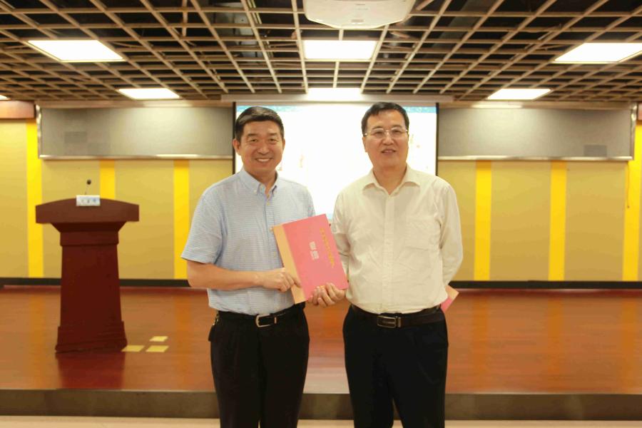 省档案馆馆长黄国雄(右)向市档案馆馆长张明权(左)颁发证书