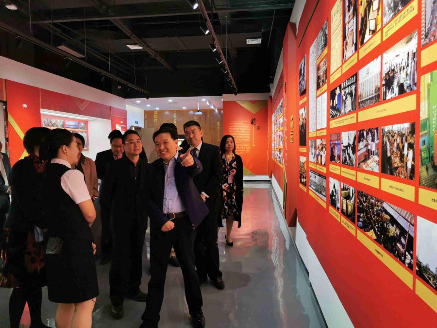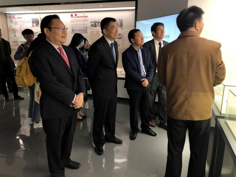 余从斌(左三)在张明权(左四)的陪同下观看壮丽70年 奋斗新时代——大武汉发展成就档案文献展