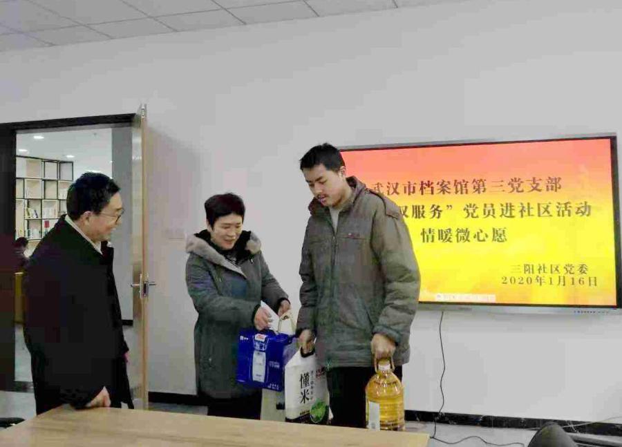 为了让困难群众切实感受到党和政府的关怀和温暖,按照全市关于开展春节前走访慰问困难群众的工作要求,市档案馆机关党委精心安排、积极组织,各党支部结合“双万双联”“双进双服务”活动,从1月15日开始陆续走访慰问结对社区的困难群众。1月16日,市档案馆副馆长、机关党委书记刘望云带队前往结对帮扶的三阳社区,为困难群众送去了大米、食用油、牛奶等慰问物资,并用春联送上新春祝福。
