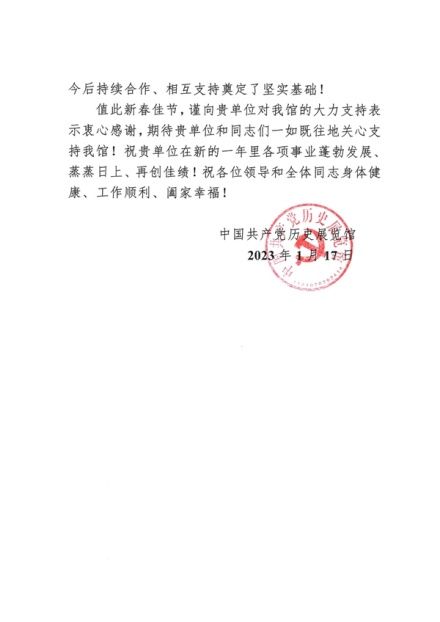 一元欣复始,万象喜更新。在中国农历兔年新春即将来临之际,我馆收到中国共产党历史展览馆的致谢信,对我馆在协调提供“不忘初心、牢记使命”中国共产党历史展览展品中的付出和努力表示感谢。