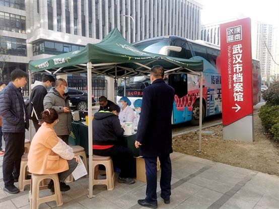 当献血车驶入市档案馆停车场后,志愿者们听取医务人员讲解献血相关知识,按要求进行献血登记、测量血压、采血检验等准备工作。经过严格筛选后合格的同志依次登上献血车开始献血。