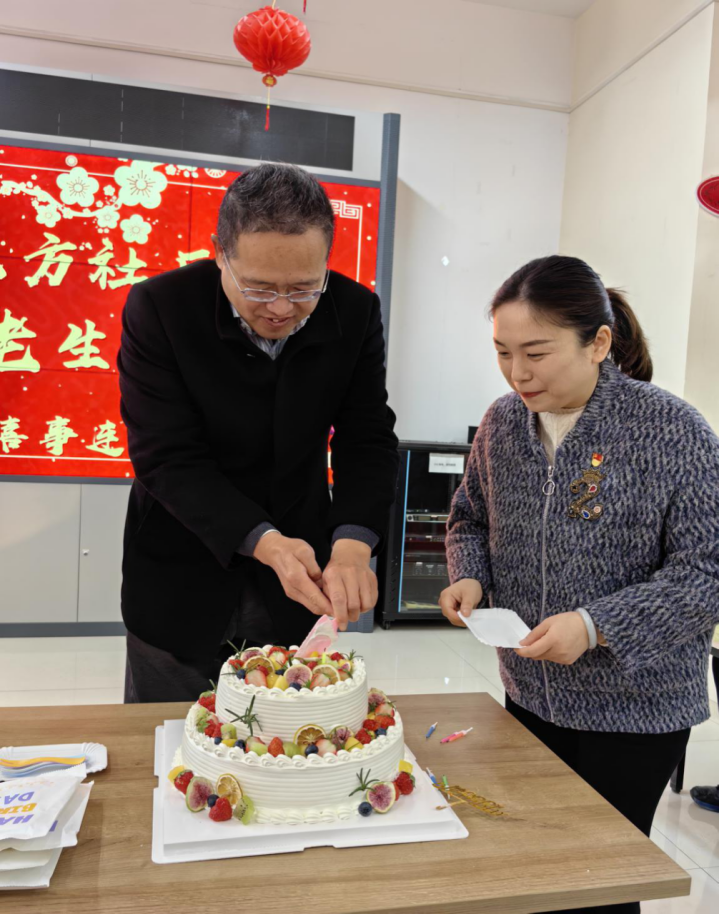 市档案馆馆长徐辉、东方社区党委书记南璇共同为寿星切生日蛋糕