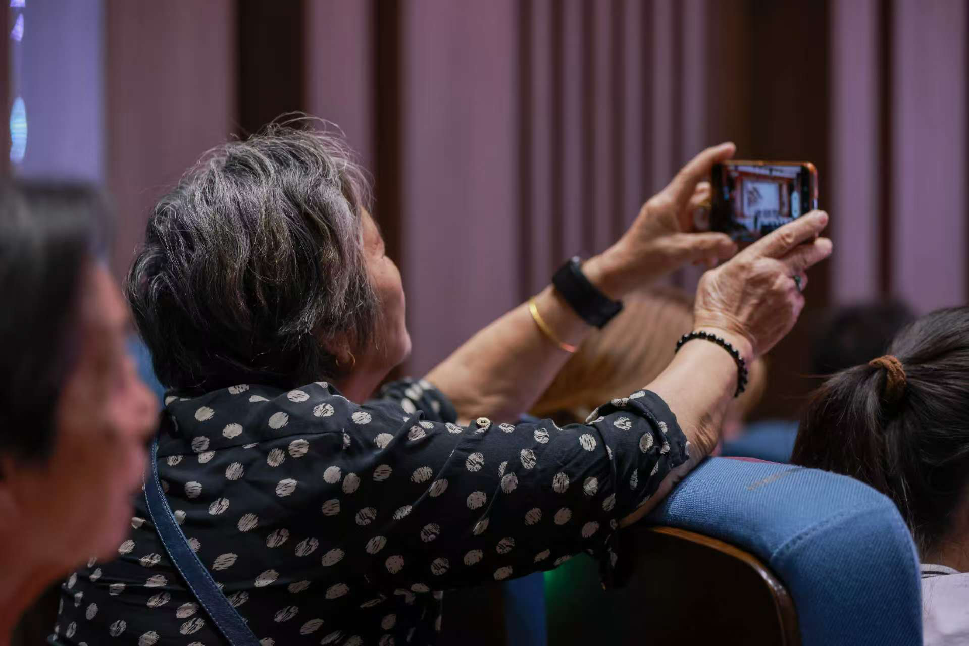 观众席里,两位老人格外引人注目,她们胸前佩戴着党徽,紧紧握着手,神情激动。唐奶奶和郑奶奶都出生于1943年前后,有着40多年的党龄。在这对老姐妹80余年的人生中,亲历了从山河破碎到胜利、复兴的巨变。听到熟悉的《游击队歌》《松花江上》,回忆涌上心头:“听得我们心潮澎湃,那个时候中国多难啊,现在又多幸福啊,这么多年,这么大的变化,真是太不容易了,一定要好好珍惜。”